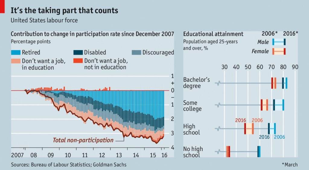 The labor market got crushed by the Bush Recession, and then millions of Boomers took retirement and Millennials stayed in school. The labor market is getting better, but slowly.